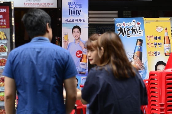 = 관광객들이 28일 서울 중구 명동 술을 선전하는 광고판 앞에서 얘기를 나누고 있다. 기획재정부와 국세청 등은 지난해 주세가 총 3조2,275억원으로 전년보다 13.2% 증가했고 역대 처음으로 3조원을 넘어섰다고 밝혔다. 최근 식품의약품안전처가 발표한 상반기 주류 소비·섭취 실태에 따르면 한국인의 1회 평균 음주량은 맥주의 경우 4.9잔(200㎖ 기준) 소주는 6.1잔인 것으로 나타났다. 식약처는 “남성은 세계보건기구(WHO)가 제시한 적정량보다 소주를 많이 마시고 있었으며 여성은 모든 주종에서 WHO 기준보다 더 많이 마셨다”고 덧붙였다. 2016.8.28/뉴스1 |