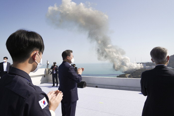 문 대통령은 “로켓 발사체는 기술 이전을 해 주지 않기 때문에 300여 기업이 참여해 순 우리기술로 이룬 쾌거”라며 “이제 우리도 우리 위성을, 우리 발사체로, 우리 땅에서 발사할 수 있게 됐다”라고 말했다.