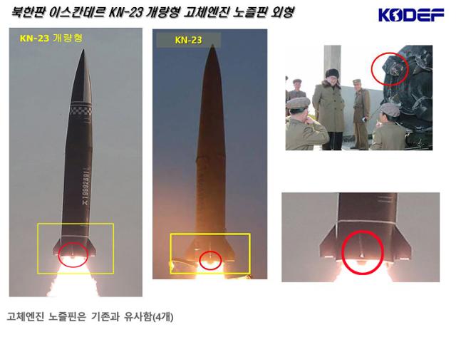 북한이 25일 새로 개발한 신형전술유도탄 시험발사를 진행했다며 탄도미사일 발사를 공식 확인했다. 이번 신형전술유도탄은 탄두 중량을 2.5t으로 개량한 무기체계라고 조선중앙통신이 26일 보도했다. 이 신형전술유도탄은 지난 1월 8차 노동당 대회 열병식에서 공개한 북한판 이스칸데르(KN-23) 개량형으로 추정된다. 당시 기존 KN-23보다 탄두 모양이 뾰족해진 개량형 이스칸데르가 공개됐다. 사진은 기존 KN-23과 개량형의 고체엔진 노즐핀 외형 비교. 빨간색 동그라미로 표시된 고체엔진 노즐핀은 기존과 개량형의 형태가 유사하다. 신종우 한국국방안보포럼(KODEF) 전문연구위원 제공. 연합뉴스 |