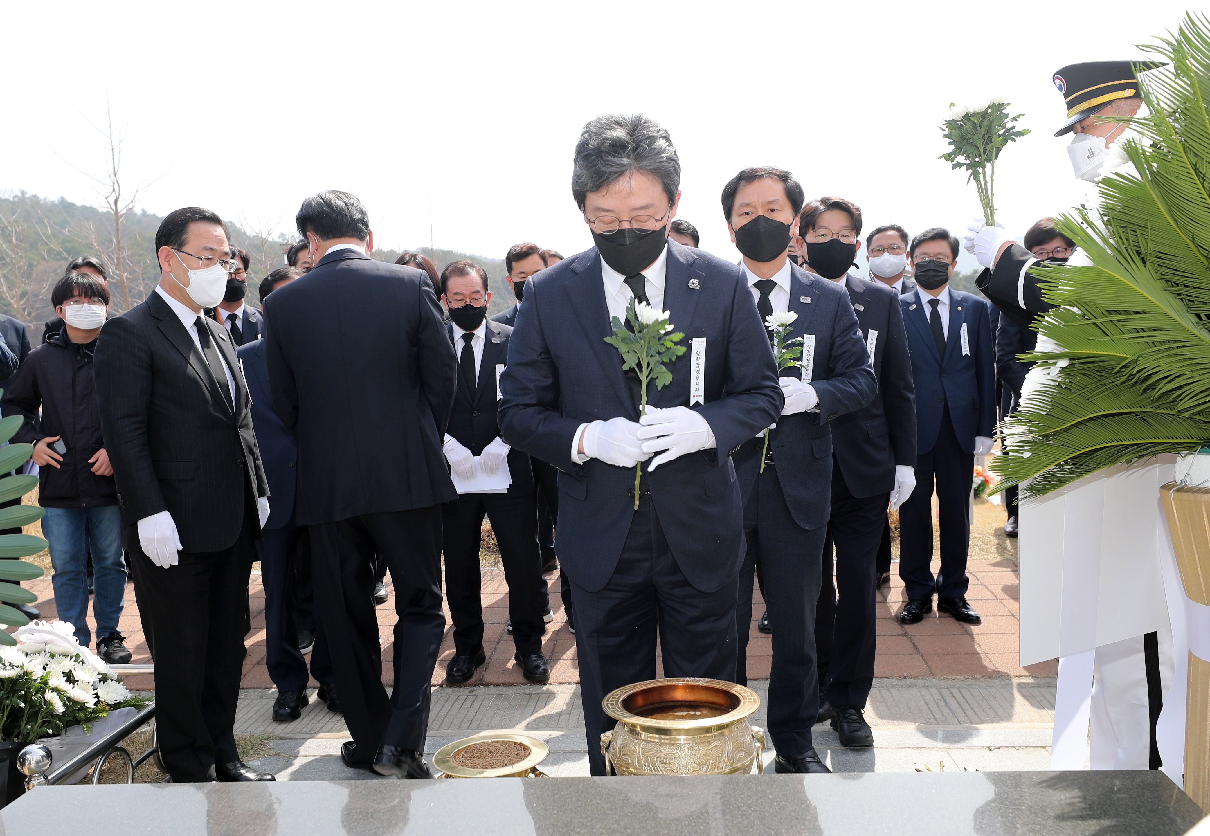 유승민 전 국민의힘 의원이 서해수호의 날인 26일 오전 대전시 유성구 갑동 국립대전현충원 천안함 46용사 묘역에서 헌화하고 있다. /연합뉴스 |