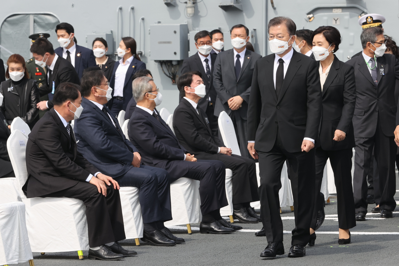 문재인 대통령과 부인 김정숙 여사가 26일 오후 경기도 평택시 해군 2함대사령부 천자봉함·노적봉함에서 열린 제6회 서해수호의 날 기념식에 참석하고 있다. 연합뉴스 |