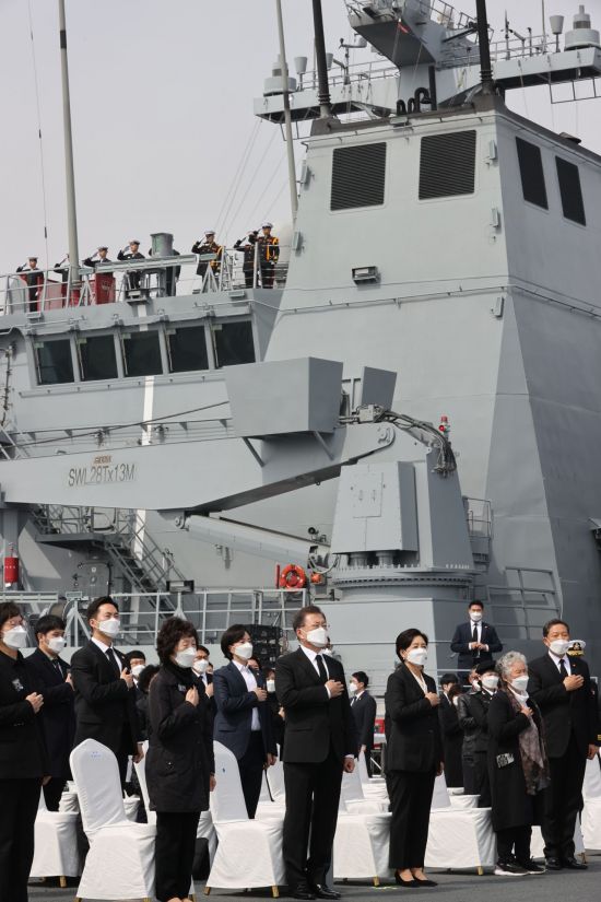 문 대통령은 "‘천안함’의 부활을 누구보다 간절한 마음으로 염원하고 성원해오신 유가족과 최원일 전 함장을 비롯한 천안함 생존 장병들께 위로와 함께 감사의 말씀을 드린다"면서 "장엄한 애국의 역사를 새긴 서해수호 영웅들께 깊은 경의를 표하며, 국민과 함께 영원한 안식을 기원한다"고 말했다.