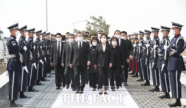 문재인 대통령과 김정숙 여사가 26일 오후 경기도 평택시 해군 2함대사령부 천자봉함·노적봉함에서 열린 제6회 서해수호의 날 기념식에 참석하고 있다. /뉴시스 |