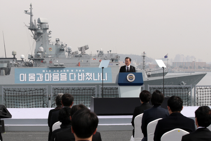 문 대통령은 2023년 진수하는 신형 대구급 호위함 7번함의 함명을 ‘천안함’으로 명명했다. 문 대통령은 “천안함은 영웅들과 생존 장병들의 투혼을 담아 찬란하게 부활할 것”이라고 했다. 이어 “강한 국방력과 안보로 나라와 국민의 평화를 지키는 것만이 서해 영웅들의 희생에 진정으로 보답하는 길”이라며 “지난 4년 서해에서 무력충돌이나 군사적 도발로 다치거나 생명을 잃은 장병이 단 한 명도 없다”고 말했다.
