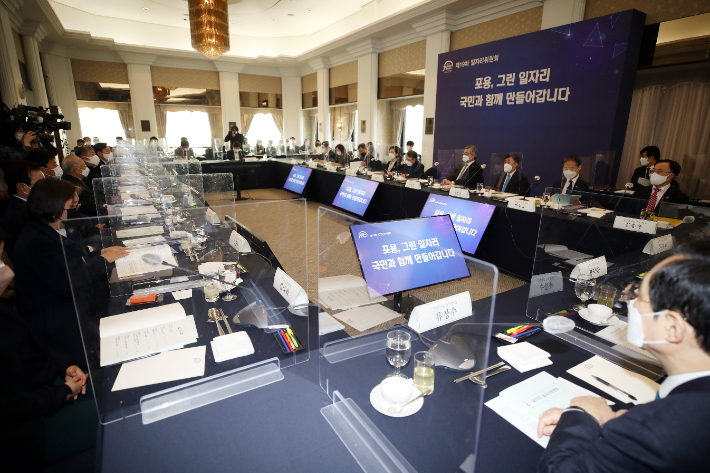 지난 26일 오전 서울 프레스센터에서 열린 일자리위원회에서 김용기 일자리위원회 부위원장이 발언하고 있다. 연합뉴스 |