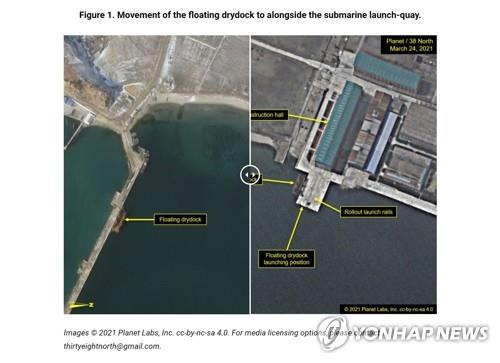 38노스에 따르면 신포조선소 인근 부두에 보통 정박해온 드라이독이 잠수함 진수 시설 옆에서 포착되기는 이례적이다.