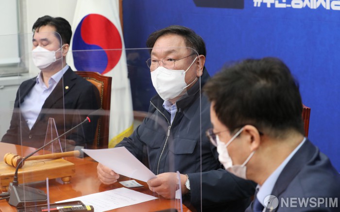 [서울=뉴스핌] 윤창빈 기자 = 김태년 더불어민주당 당대표 직무대행(왼쪽 둘째)이 28일 오후 국회에서 열린 최고위원회의에서 오세훈 국민의힘 서울시장 후보의 사퇴를 촉구하고 있다. 2021.03.28 pangbin@newspim.com