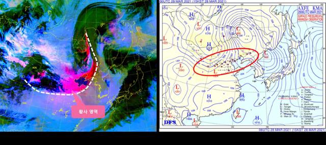 기상청은 26일부터 몽골 고비사막에서 황사가 발원하기 시작했으며, 27일과 28일 몽골에서 발달한 고기압과 중국 내몽골 고원에서 발달한 저기압 사이에서 기압 차가 크게 벌어지면서 강한 바람으로 인해 중국 내몽골 고원에서도 황사가 추가로 발원했다고 밝혔다. 황사 위성영상(28일 오후 5시)과 황사 관측지역(28일 오후 3시). 기상청 제공 |