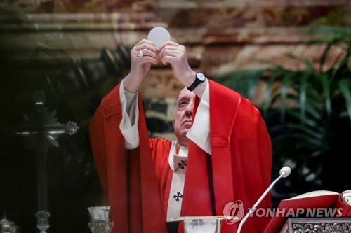28일(현지시간) 바티칸 성베드로대성당에서 예수 수난 성지주일 미사를 집례하는 프란치스코 교황. [로이터=연합뉴스] |