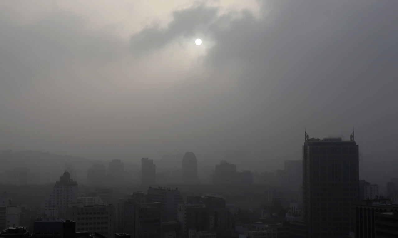 기상청은 29일 오전 7시10분을 기해 서울 전역에 황사경보를 발효한다고 밝혔다. 황사경보는 황사로 인해 시간당 평균 미세먼지 농도가 800㎍/㎥ 이상인 상태가 2시간 이상 계속될 것으로 예측될 때 발효된다. 서울 시내 도심이 뿌옇게 변해 태양이 빛을 잃고 있다. [연합] |