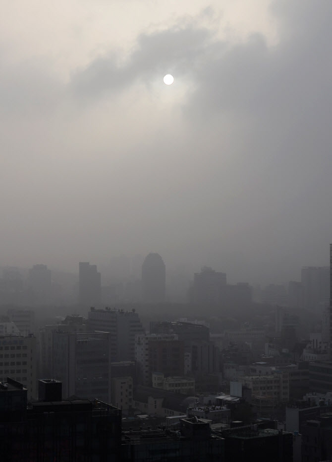 기상청은 29일 오전 7시 10분을 기해 서울 전역에 황사경보를 발효한다고 밝혔다. 서울 시내 도심이 뿌옇게 변해 태양이 빛을 잃고 있다.(사진=연합뉴스 제공) |