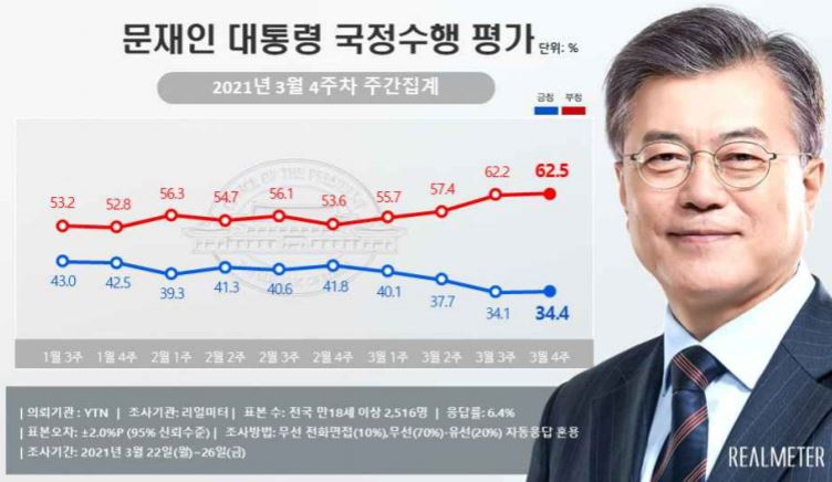 리얼미터가 YTN 의뢰로 지난 22~26일 닷새 간 전국 18세 이상 유권자 2516명에게(무선전화 80% + 유선전화 20%) 자동응답시스템(ARS)으로 물은 결과, '문 대통령이 국정수행을 잘못하고 있다'는 부정평가는 전주 대비 0.3%포인트(P) 오른 62.5%(매우 잘못함 47.2%+잘못하는 편 15.3%)를 기록했다. 부정평가 62.5%는 리얼미터 조사 중 역대 최고치다.