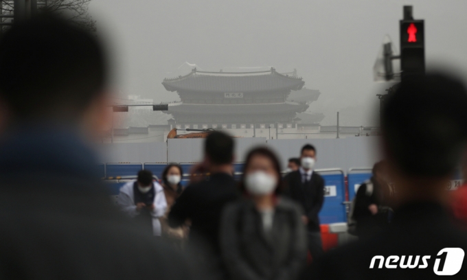 (서울=뉴스1) 오대일 기자 = 중국발 황사로 사상 최악의 대기질을 보인 29일 오전 서울 종로구 광화문네거리에서 직장인들이 출근길 발걸음을 옮기고 있다. 이날 서울 전역에 황사경보와 미세먼지(PM-10) 경보와 초미세먼지(PM-2.5) 주의보가 동시에 내려졌다. 2021.3.29/뉴스1 |