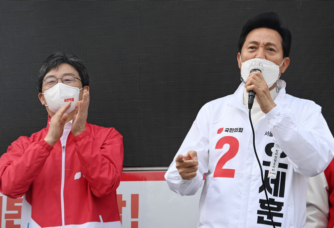 국민의힘 오세훈 서울시장 후보(오른쪽)가 26일 서울 용산구 용문시장 네거리에서 유세차량에 올라 시민들에게 지지를 호소하고 있다. 왼쪽은 유승민 공동선대위원장. (사진=국회사진기자단) |