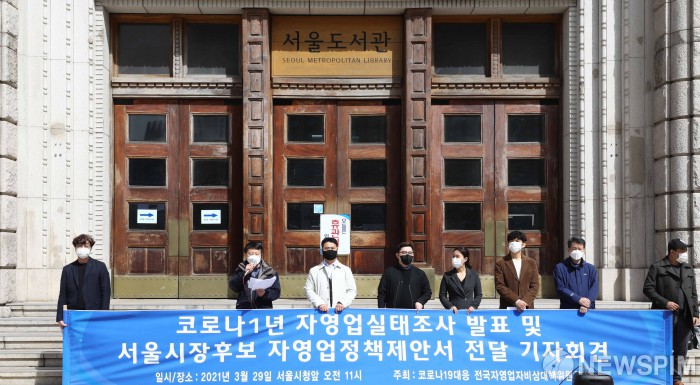 [서울=뉴스핌] 백인혁 기자 = 코로나19 대응 전국자영업자비상대책위원회 관계자들이 29일 오전 서울 중구 서울도서관 앞에서 코로나 1년 자영업실태조사 발표 및 서울시장 후보 자영업정책제안서 전달 기자회견을 하고 있다. 2021.03.29 dlsgur9757@newspim.com