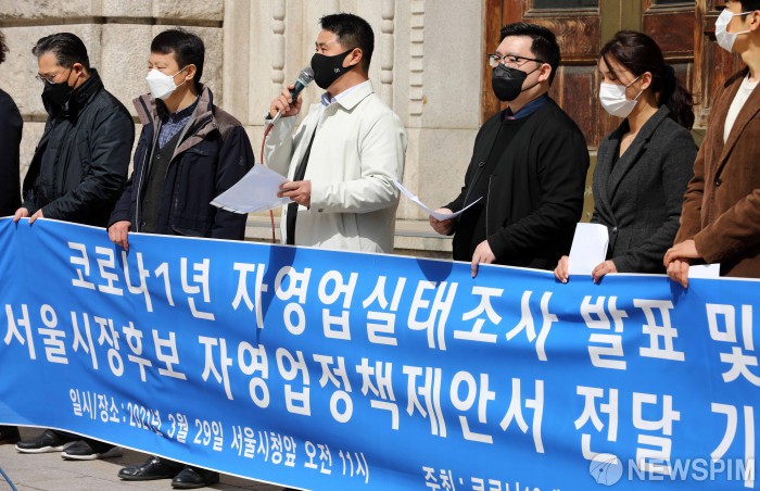 [서울=뉴스핌] 백인혁 기자 = 코로나19 대응 전국자영업자비상대책위원회 관계자들이 29일 오전 서울 중구 서울도서관 앞에서 코로나 1년 자영업실태조사 발표 및 서울시장 후보 자영업정책제안서 전달 기자회견을 하고 있다. 2021.03.29 dlsgur9757@newspim.com