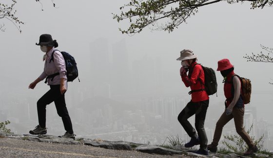 미세먼지 경보가 내려진 29일 낮 부산 남구 황령산 전망대에서 바라본 해운대 일대 시가지가 뿌옇게 보인다. 송봉근 기자 |