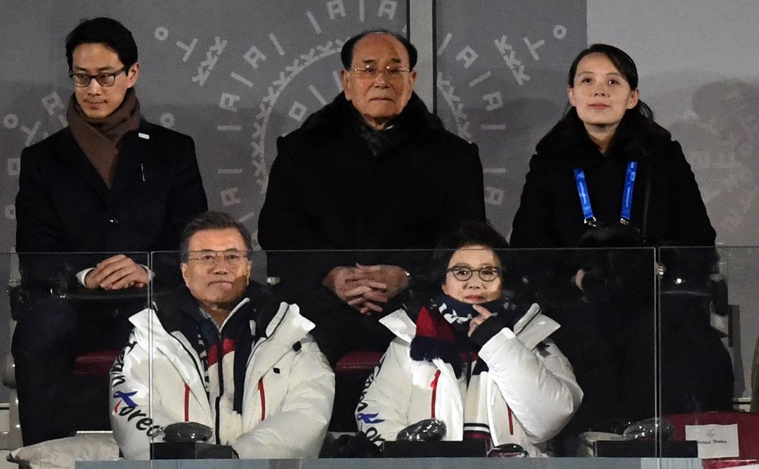 9일 오후 강원도 평창 올림픽 스타디움에서 열린 2018 평창동계올림픽 개회식에 참석한 문재인 대통령과 김정숙 여사가 북한 김영남 김여정 앞에 앉아 있다. |