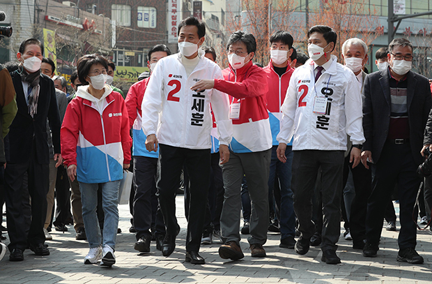 4·7 보궐선거 공식 선거운동 첫날인 25일 오세훈 국민의힘 서울시장 후보가 남대문시장을 방문해 유승민,지상욱 전 의원과 선거유세를 하고 있다. 2021.03.25. [이승환기자] |