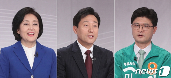 박영선 더불어민주당 서울시장 후보(왼쪽부터), 오세훈 국민의힘 서울시장 후보, 이수봉 민생당 서울시장 후보가 30일 오후 서울 여의도 KBS에서 열린 서울시장 보궐선거 후보자 초청 토론회에서 인사말을 하고 있다. /사진=뉴스1 |