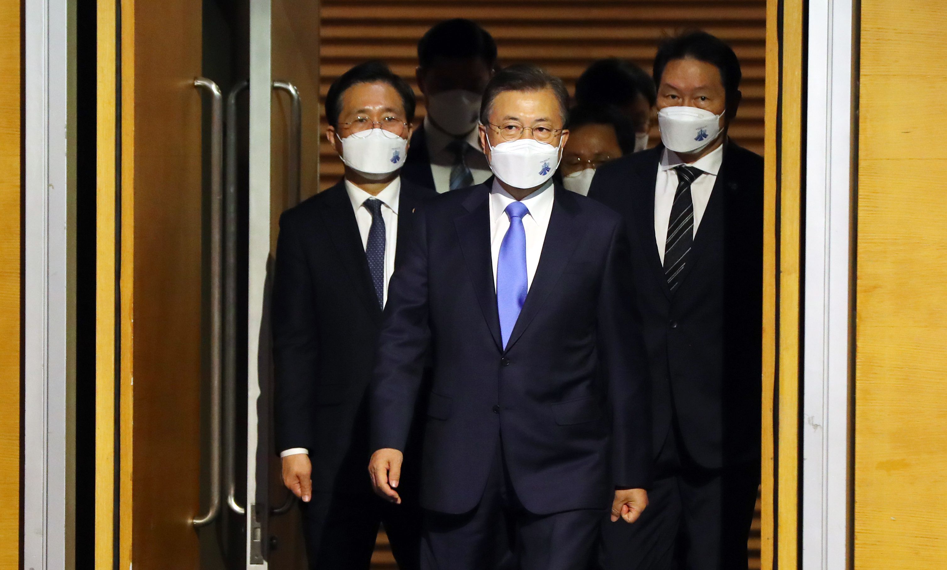 문 대통령은 회장단에 김범수 카카오 의장, 이한주 베스핀글로벌 대표 등 IT 및 벤처산업 관계자들이 참여한 것에 대해선 “새로운 산업을 대표하는 분들이 회장단으로 새로 호흡을 맞추게 되어 어느 때보다도 국민들의 기대가 크다”고 했다.