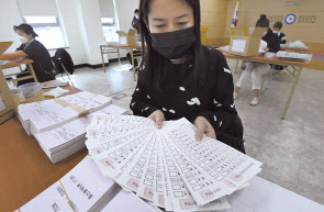 4. 7 서울특별시장보궐선거를 1주일 앞 둔 31일 오전 서울 동대문구선거관리위원회에서 관계자들이 투표용지 검수(자체검수)를 하고 있다. 박해묵 기자 |