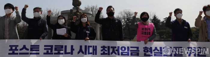 [서울=뉴스핌] 백인혁 기자 = 최저임금연대회의 관계자들이 31일 오전 서울 종로구 청와대 앞 분수대 광장에서 포스트 코로나 시대 최저임금 현실화를 위한 최저임금연대회의 기자회견을 열고 구호를 외치고 있다. 이들은 저임금·저소득 계층의 소득 보장을 위한 최저임금 인상 등을 촉구했다. 2021.03.31 dlsgur9757@newspim.com