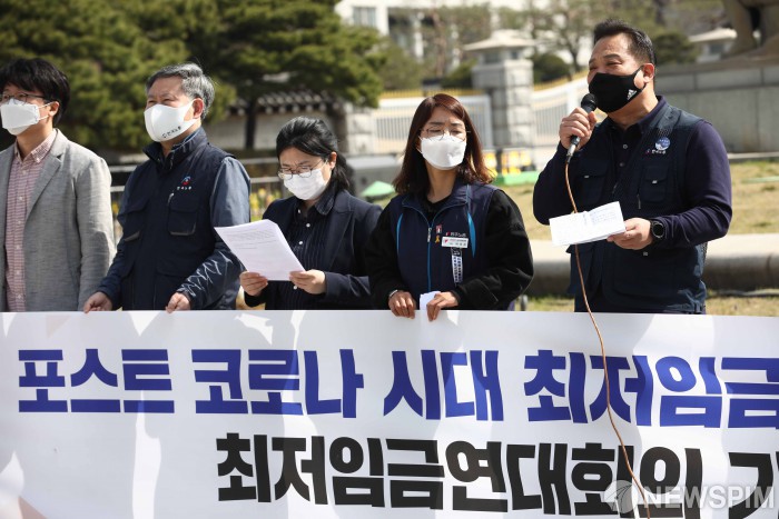 [서울=뉴스핌] 백인혁 기자 = 최저임금연대회의 관계자들이 31일 오전 서울 종로구 청와대 앞 분수대 광장에서 포스트 코로나 시대 최저임금 현실화를 위한 최저임금연대회의 기자회견을 하고 있다. 이들은 저임금·저소득 계층의 소득 보장을 위한 최저임금 인상 등을 촉구했다. 2021.03.31 dlsgur9757@newspim.com