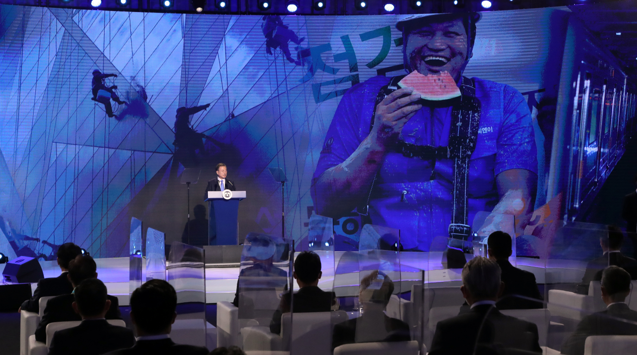 문재인 대통령이 31일 오전 서울 중구 대한상공회의소에서 열린 제48회 상공의 날 기념식에서 축사하고 있다. [연합] |