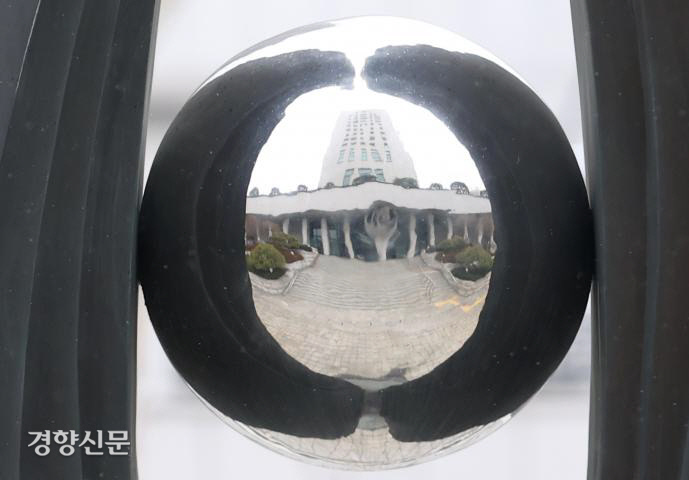 서울 서초구 대검찰청 앞 ‘서 있는 눈’ 조형물에 청사가 반영되어 보인다. 연합뉴스 |
