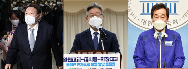차기 대선주자 지지도에서 윤석열(왼쪽) 전 검찰총장과 이재명(가운데) 경기지사의 양강구도가 지속되고 있는 가운데 윤 전 총장이 오차범위 내에서 1위를 달리고 있다는 여론조사 결과가 1일 나왔다.(사진=이데일리DB) |