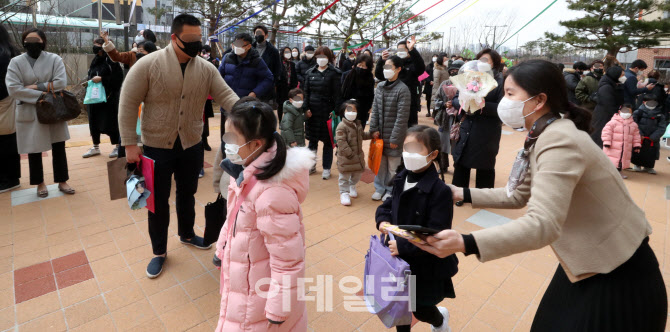 2021학년도 초·중·고교 신학기 첫 등교가 시작된 지난달 2일 서울 강동구 강빛초등학교에서 1학년 신입생들이 선생님을 따라 이동하고 있다.(사진=뉴시스) |