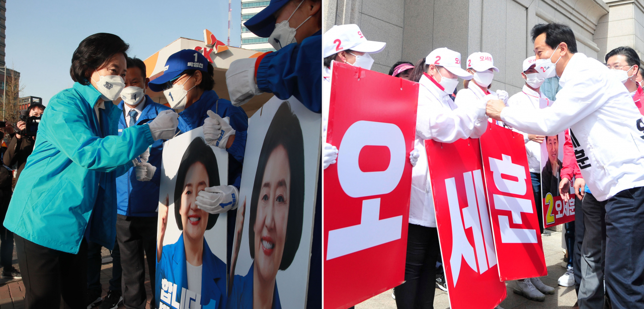 4·7 재보선 더불어민주당 박영선 서울시장 후보(왼쪽)가 1일 서울 마포구 합정역 인근에서 선거운동원들과 인사하고, 국민의힘 오세훈 서울시장 후보가 이날 성북구 길음동 현대백화점 앞에서 열린 유세에서 선거운동원들과 인사하고 있다. 연합뉴스 |