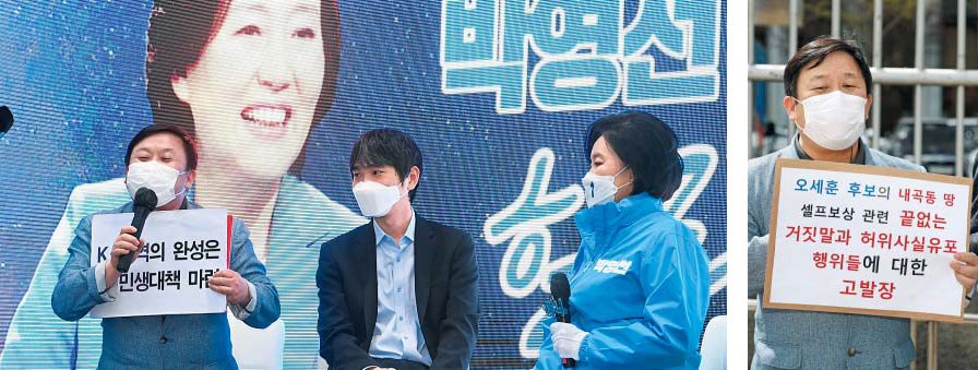 안진걸 민생경제연구소장이 지난달 31일 서울 관악구 서울대입구역 인근에서 열린 ‘박영선의 힐링캠프’ 유세에서 박영선 더불어민주당 서울시장 후보 지원 유세를 하고 있다. 왼쪽부터 안 소장, 이세돌 전 바둑 기사, 박영선 후보(왼쪽 사진). 오른쪽 사진은 안 소장이 1일 서울 서대문구 경찰청 앞에서 광화문촛불연대·시민단체 회원들과 함께 국민의힘 오세훈 서울시장 후보 고발 기자회견을 열고 후보 사퇴를 촉구하는 모습. /뉴데일리 제공·연합뉴스 |
