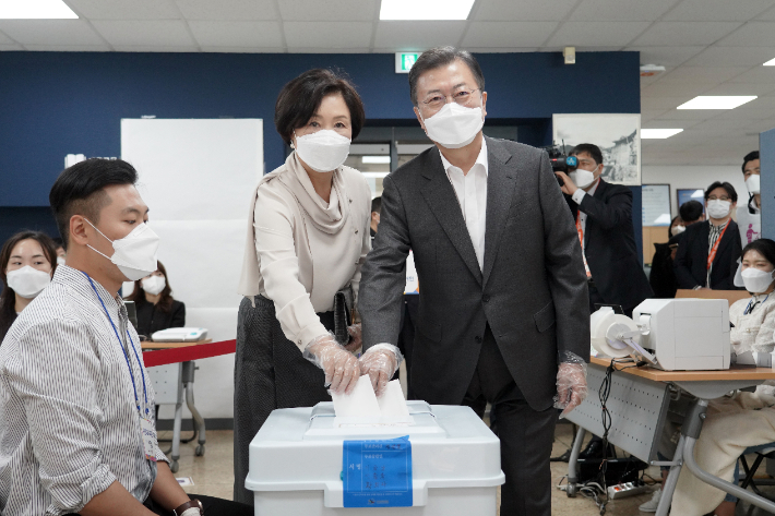 문 대통령 내외는 이날 오전 8시 58분쯤 삼청동주민센터를 찾아 한표를 행사했다. 사전투표를 독려하기 위해서다. 문 대통령은 지난 2018년 지방선거와 2020년 총선에도 사전투표 첫날 투표했다.