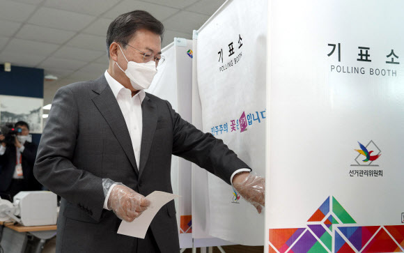 문재인 대통령이 2일 서울시 종로구 삼청동 주민센터에 마련된 2021재·보궐선거 사전투표소에서 기표소로 들어서고 있다. 뉴시스 |