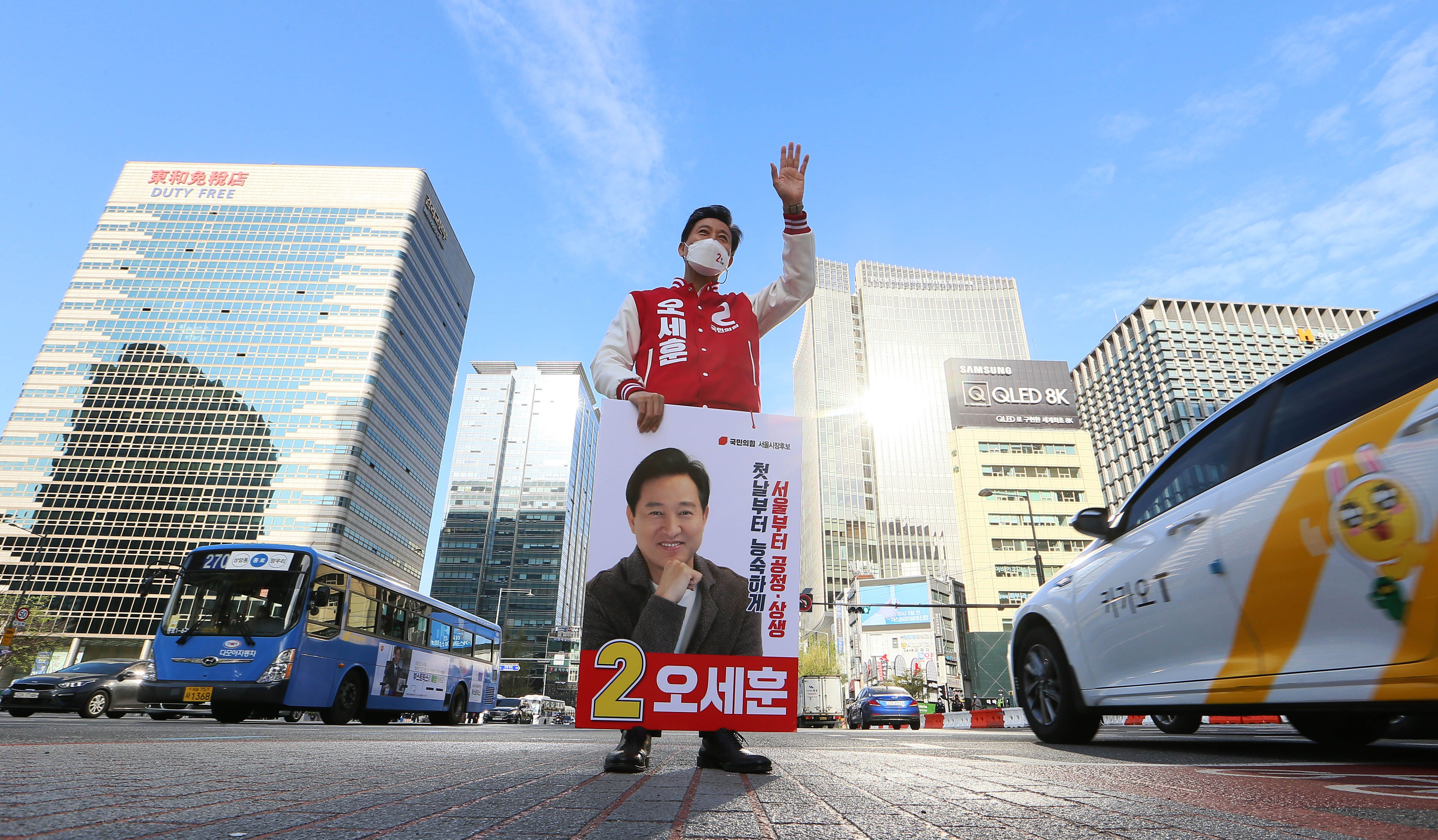 오세훈 국민의힘 서울시장 후보가 2일 오전 서울 세종대로 사거리에서 시민들에게 인사하고 있다./국회사진기자단 |