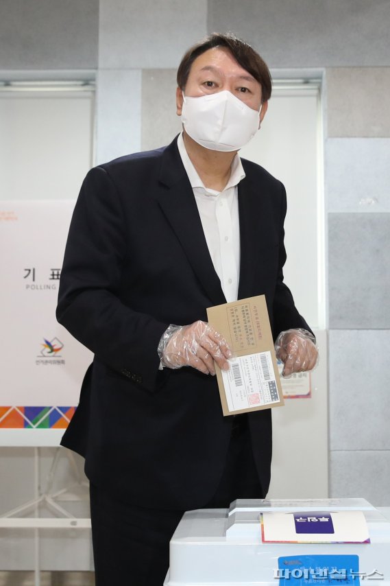 윤석열 전 검찰총장이 4·7 서울시장 보궐선거 사전투표 첫날인 2일 서울 서대문구 남가좌1동 주민센터에 마련된 사전투표소에서 투표하고 있다. 사진=서동일 기자