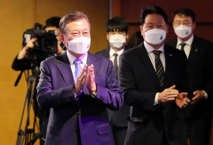 [서울=뉴시스]추상철 기자 = 문재인 대통령과 최태원 대한상공회의소 회장이 31일 오전 서울 중구 대한상공회의소에서 열린 제48회 상공의 날 기념식에 참석하고 있다. 2021.03.31. scchoo@newsis.com |