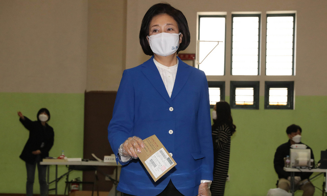 박영선 더불어민주당 서울시장 후보가 2일 오전 서울 종로구청에 마련된 사전투표소에서 투표를 하고 있다. 뉴시스 |