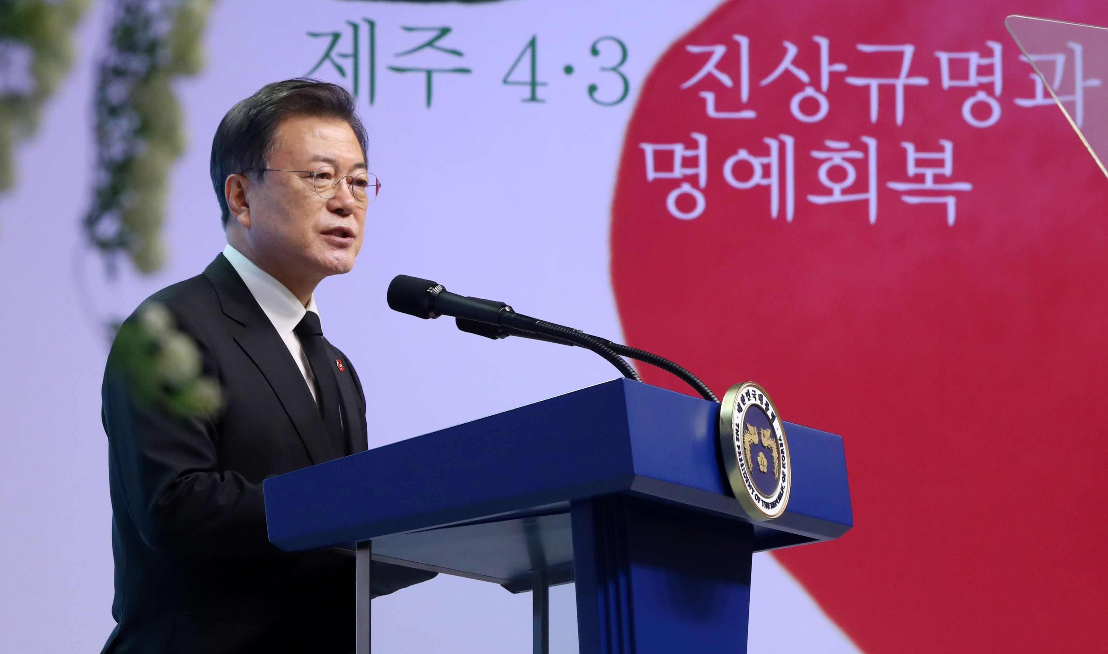 문재인 대통령이 3일 오전 제주 4·3 평화교육센터에서 열린 제73주년 제주 4·3 희생자 추념식에 참석해 추념사를 하고 있다. 2021.04.03/뉴시스 |