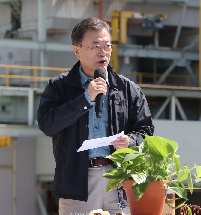 문재인 대통령이 5일 마포구 서울복합화력발전소에서 열린 제76회 식목일 기념행사에서 식수를 마치고 발언하고 있다.(사진=연합뉴스) |