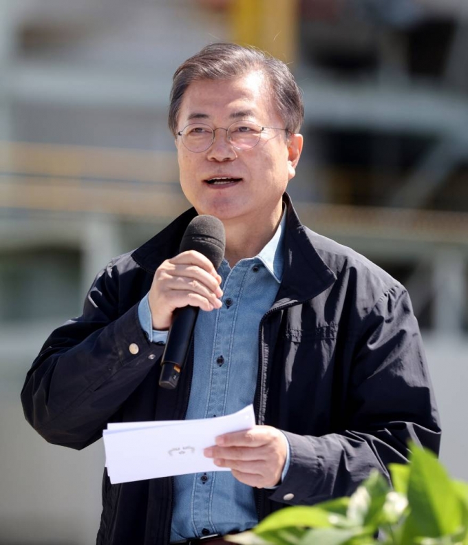 [서울=뉴시스]박영태 기자 = 문재인 대통령이 5일 서울 마포구 서울복합화력발전소에서 열린 제76회 식목일 기념행사에서 식수를 마치고 발언하고 있다. 2021.04.05. since1999@newsis.com |