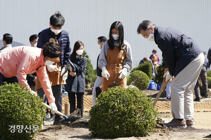 이날 문 대통령 부부의 나무심기 행사에는 ‘참고 견뎌냄’이라는 꽃말을 가진 회양목이 사용됐다. 청와대는 “코로나 극복 의지를 담은 것”이라고 설명했다.