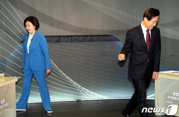 (서울=뉴스1) 국회사진취재단 = 박영선 더불어민주당 서울시장 후보(왼쪽)와 오세훈 국민의힘 서울시장 후보가 5일 오후 서울 양천구 양천구 대한민국예술인센터에서 열린 방송기자클럽 초정 서울시장 보궐선거 후보자 토론회에 앞서 기념촬영을 마치고 자리로 향하고 있다. 2021.4.5/뉴스1 |