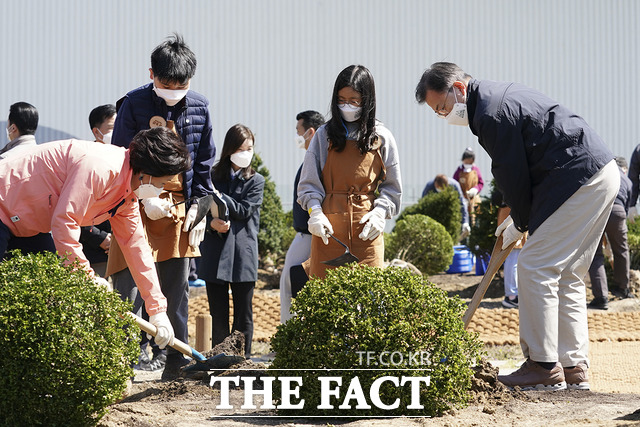 문재인 대통령과 김정숙 여사는 식목일인 5일 상지초등학교 상지숲사랑청소년단과 함께 우리나라 최초의 화력발전소였던 서울복합화력발전소에서 회양목을 심었다. /청와대 제공 |