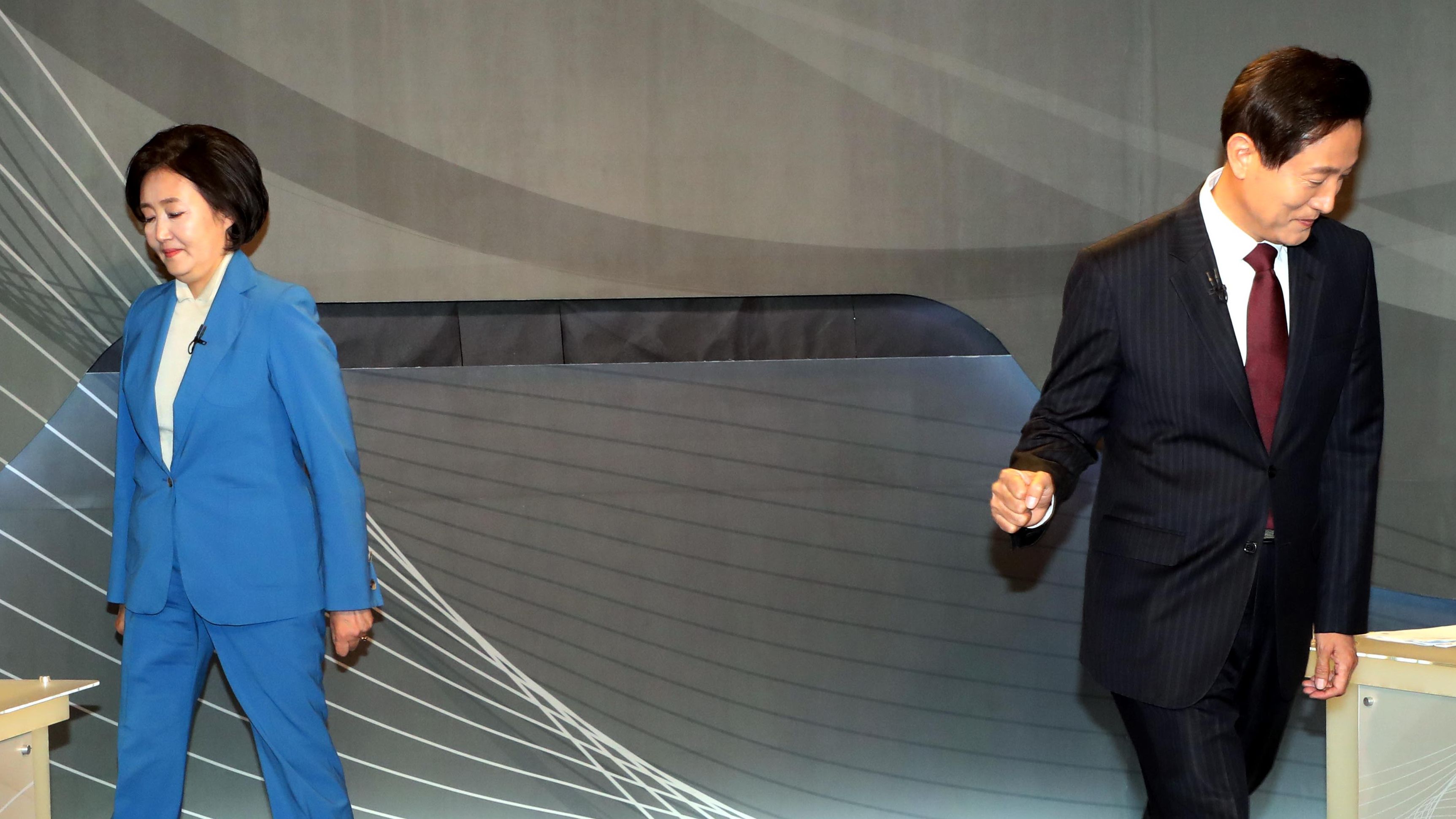 두 후보는 이날 ‘서로 칭찬해보라’는 진행자의 말에 어색한 웃음을 짓기도 했다. 박 후보는 “오 후보를 칭찬할 만큼 우리가 같이 공유한 시간이 없었다”면서 “언변이 좋으신 것 같고, 패션 감각이 뛰어나신 것 같다”고 했다. 오 후보는 “집념과 열정으로 유리천장을 돌파해 젊은 여성들에게 희망을 줬다”며 “끝까지 승승장구해 여성들에게 좋은 롤모델이 되실 것”이라고 말했다.
