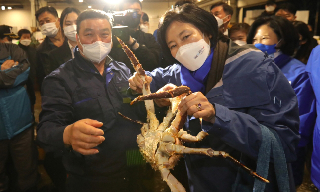 4.7 재·보궐선거를 하루 앞둔 6일 오전 박영선 더불어민주당 서울시장 후보가 서울시 동작구 노량진 수산시장을 방문해 수산물을 들고 포즈를 취하고 있다. 박영선 후보 캠프 제공 |