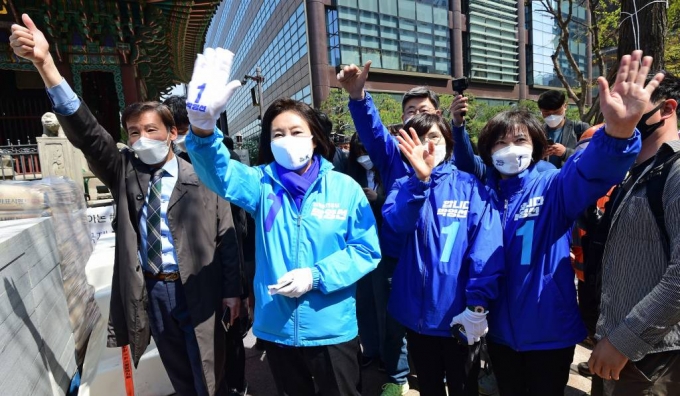 [서울=뉴시스]국회사진기자단 = 박영선 더불어민주당 서울시장 후보가 6일 서울 광화문 일대 거리에서 버스에 탑승한 시민들을 향해 손을 흔들고 있다. 2021.04.06. photo@newsis.com |