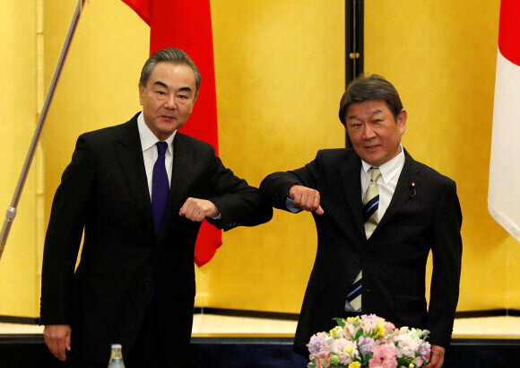 왕이 중국 외교부장과 모테기 도시미쓰 일본 외무상. 도쿄/ 로이터 연합뉴스 |